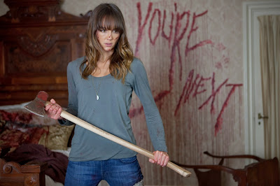 Regissören Adam Wingard har tidigare gjort A HORRIBLE WAY TO DIE, en hyfsad men rätt överskattad liten film. Redan innan jag såg nyss nämnda film hade jag hunnit läsa en hel del om YOU’RE NEXT – detta är nämligen en väldigt hajpad film. Fangoria och Rue Morgue skrev massor redan innan filmen hunnit premiärvisas, den har tillbringat de senaste två åren på festivaler, och på Fantastisk Filmfestival i Lund härommånaden vann den Publikens Pris.