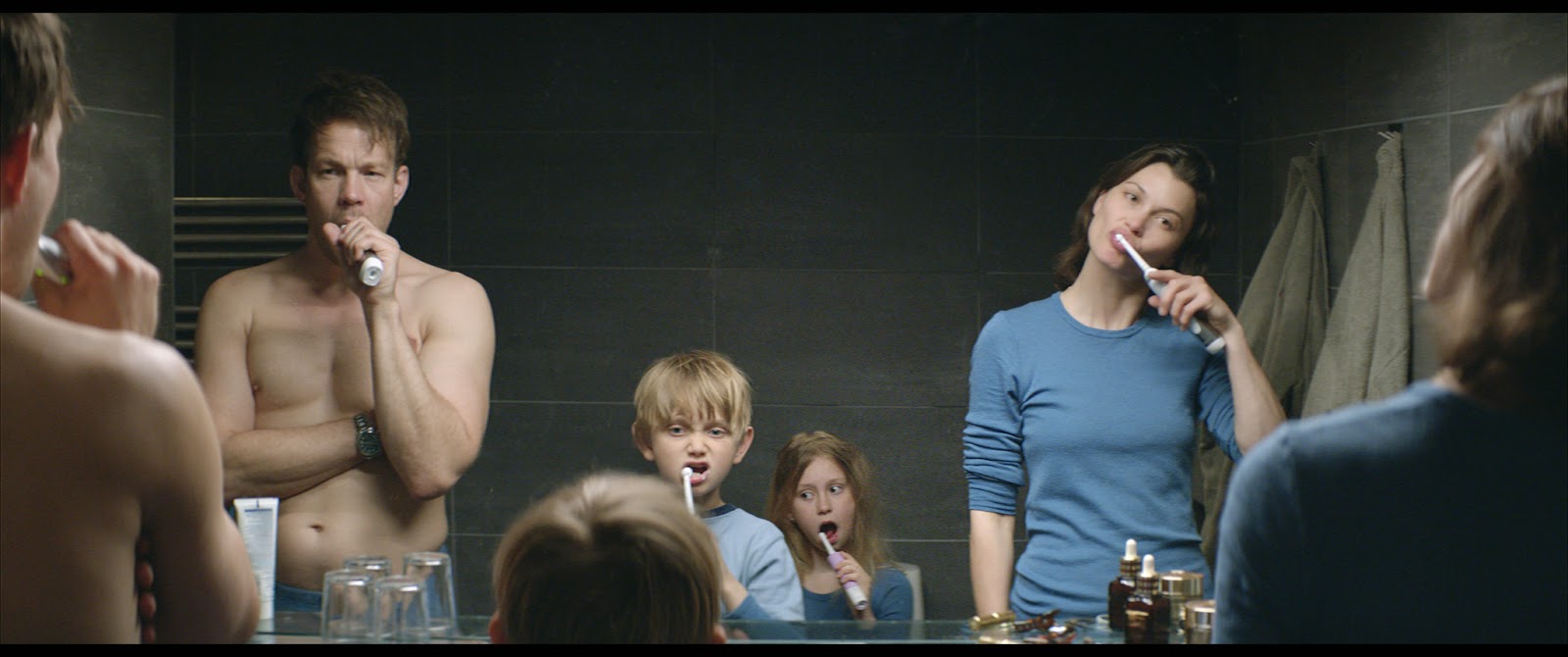 Filmen börjar med att vi får se sonen i familjen stå och kissa inne på en herrtoalett. Sedan tvättar han händerna. En synnerligen nödvändig scen. Det finns säkert någon djup tanke bakom detta. Eller så är det bara så att Östlund gillar att filma pojkar som kissar och bajsar. I början av filmen, när allting är frid och fröjd, ska familjen fotograferas. Morsan och farsan råkar slå ihop sina skallar så att det tjongar i skidhjälmarna. Jag gissar att detta är medveten komedi. Även på ett par andra ställen blir det lite kul.