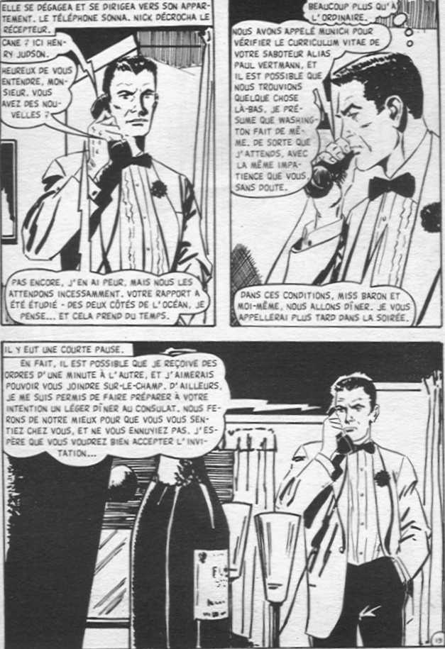 Jag har tidigare nämnt att serierna i de franska pocketböckerna gjordes av amerikaner och filippinare som oftast jobbade för USA. Men nu hittade jag fler uppgifter. Tydligen gjordes Nick Carter-serien av Huescar José och Juan Arranz, två spanjorer som flyttade till Frankrike på 70-talet. Så här såg en seriesida med Carter ut i nummer 1: