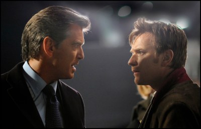 I filmversionen är Pierce Brosnan utomordentlig som Lang, spelad med en udd Blair. Filmen öppnar med att en död man spolas i land på en strand i Massa-chusetts, dit Adam Lang dragit sig tillbaka med sin fru och stab. Den döde är en författare som anlitats för att spökskriva Langs memoarer, så förlaget måste snabbt hitta en ersättare. De kontaktar en bästsäljande – och i berättelsen namnlös! – författare, som spelas av Ewan McGregor (som i eftertexterna listas som ”The Ghost”) och som inte är det minsta intresserad av politik, men som lyckas få jobbet ändå, eftersom han vet hur man skriver böcker som folk faktiskt köper.