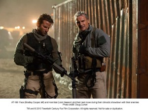 I vilket fall, filmen öppnar med att den tillfångatagne överste Hannibal King (Liam Neeson) torteras i Mexiko av härligt svartmuskiga typer i mustasch. Hannibal får stryk utan like, men eftersom detta är filmens första scen, lyckas han rymma. Efter den spektakulära rymningen drar Hannibal iväg och räddar Face (Bradley Cooper), som just ska till att avrättas någonstans i närheten. Medan han gör detta, råkar Hannibal lära känna BA Baracus (Quinton ”Rampage” Jackson), och lite senare träffare de på den extremt skicklige helikopterpiloten och helgalne Murdock (Sharlto Copley), som utger sig för att vara doktor på ett sjukhus.