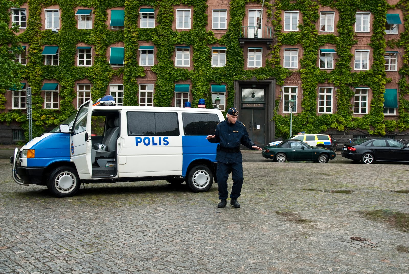 …Och så har vi vad jag tror är utställningens mest fascinerande och festliga inslag. Ett performance som heter ”Vi är svenska poliser, vi är snälla”. Det är en skådespelare i polisuniform (tyvärr ingen riktig polis) som kör runt i en polispiket till olika delar av Malmö. Under pressvisningen gick vi bort till ett av turister och sommarlediga Malmöbor fyllt Stortorget. Där kom piketen körande, den stannade på torget och ur den hoppade polisen, som knäppte på sin lilla bergsprängare som spelade gamla danshits från 80-talet. Och så började han dansa. Inget välkoreograferat Michael Jackson-tjofräs, utan lite försiktigt. Ungefär samma dansstil som på ett högstadiedisco. Som en kille som är ensam hemma och diggar lite lätt till en skiva. De förbipasserande visste inte vad de skulle tro, några japaner var roligare att titta på än den dansande polisen. Massor med mobiler plockades fram för att filma polisen, så ni kan nog förvänta er en rad videosnuttar på YouTube inom kort.