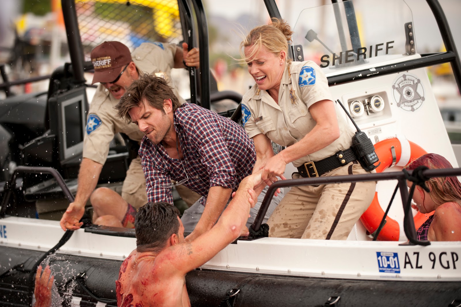 Dags att introducera våra huvudpersoner. Elizabeth Shue är den tuffa sheriffen Julie Forester, som tillsammans med sin vicesheriff (Ving Rhames) undersöker mystiska försvinnanden. Julie har en tonårig son, Jake (Steven R McQueen), som inget hellre vill än vara ute och festa med de andra kidsen i stan. Ni förstår, den här populära badorten svämmar över av sexiga brudar och partysugna snubbar. Till på köpet anländer Derrick Jones (Jerry O’Connell); en kille som producerar något slags porrvideor som dock verkar hyfsat snälla. Han ska bege sig ut i en båt med sitt team och filma några osedvanligt kåta brudar – och Jake erbjuds följa med.
