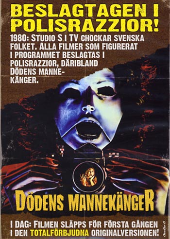 Vidare följer trailers till 25 filmer som fällts i svensk domstol. Flera av de här filmerna hade jag ingen aning om att de hamnat i rätten. Alan Birkinshaws engelska KILLER’S MOON från 1978, till exempel. Öh? Det finns väl ingen som kommer ihåg den? Vad hade den hos rätten att göra? Likaså Jim O’Connollys ONDSKANS TORN (TOWER OF EVIL) från 1972, engelsk även den. Och herregud, min favorit BLOOD FOR DRACULA?! Hur bär man sig åt för att fälla denna vackra, poetiska och roliga film? (BLOOD FOR DRACULA kallas förresten genomgående för LOVE FOR DRACULA)