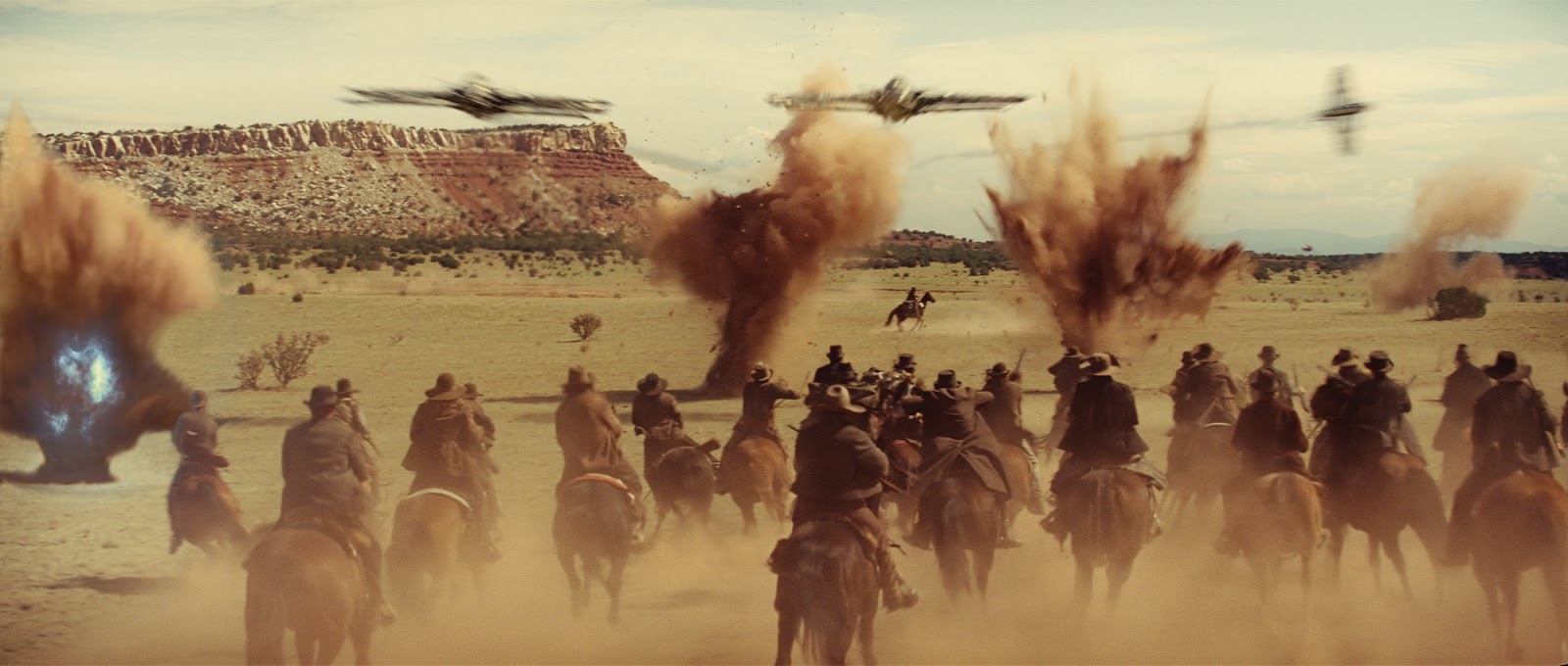 Jake och de snälla killarna måste slå sig ihop med Woodrow och de inte så snälla killarna, för att senare även sluta upp med apacher för att kunna spåra upp och oskadliggöra utomjordingarna. Således borde filmen heta COWBOYS & ALIENS & INDIANS & BANDITS & A DOG. Hade jag gjort filmen, hade den hetat COWBOYS & ALIENS & INDIANS & BANDITS & DINOSAURS & NINJAS & A DOG.