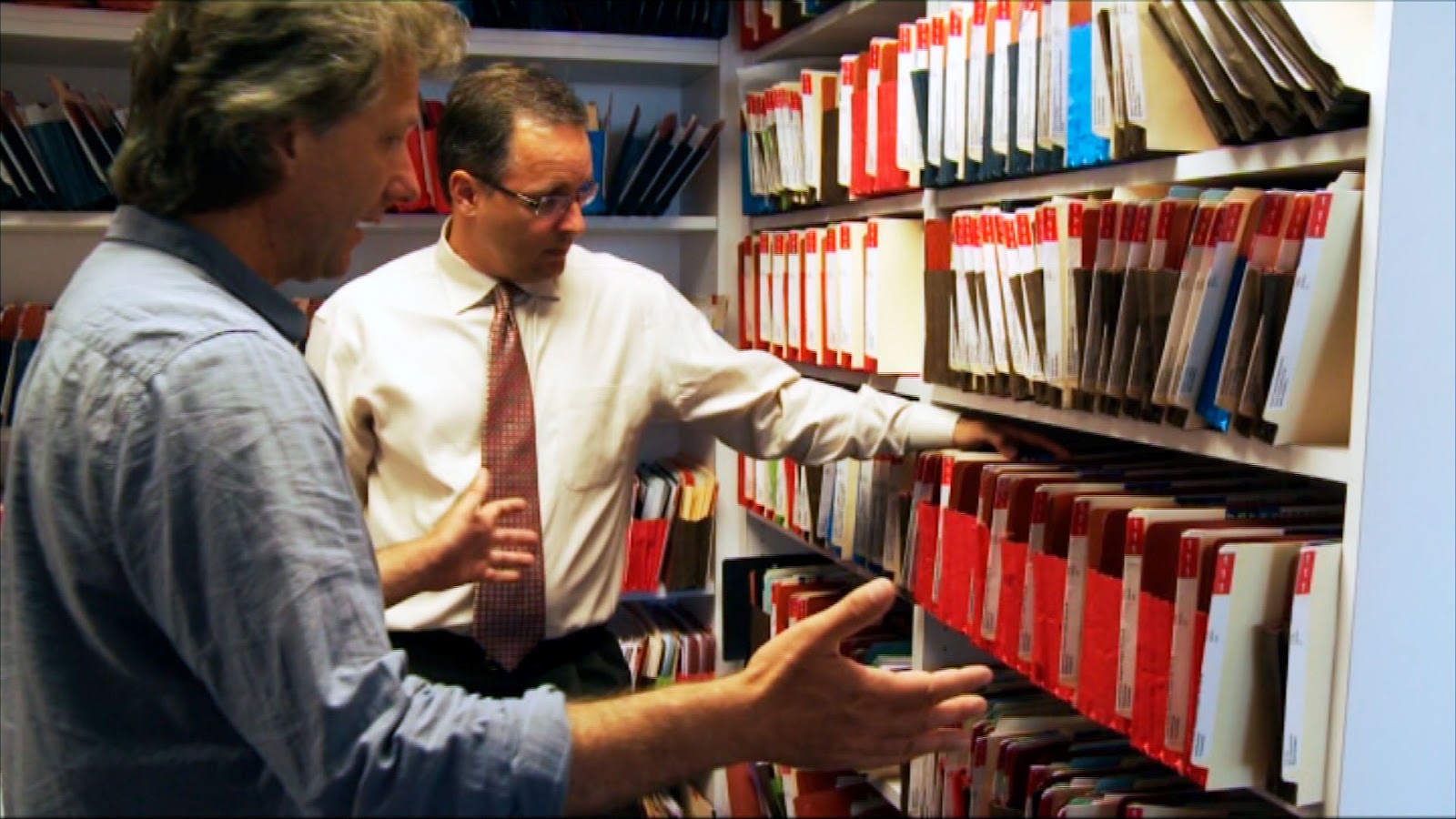 Fredrik Gerttens amerikanske advokat visar hyllan med alla dokument som rör bananfallet |