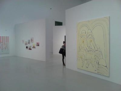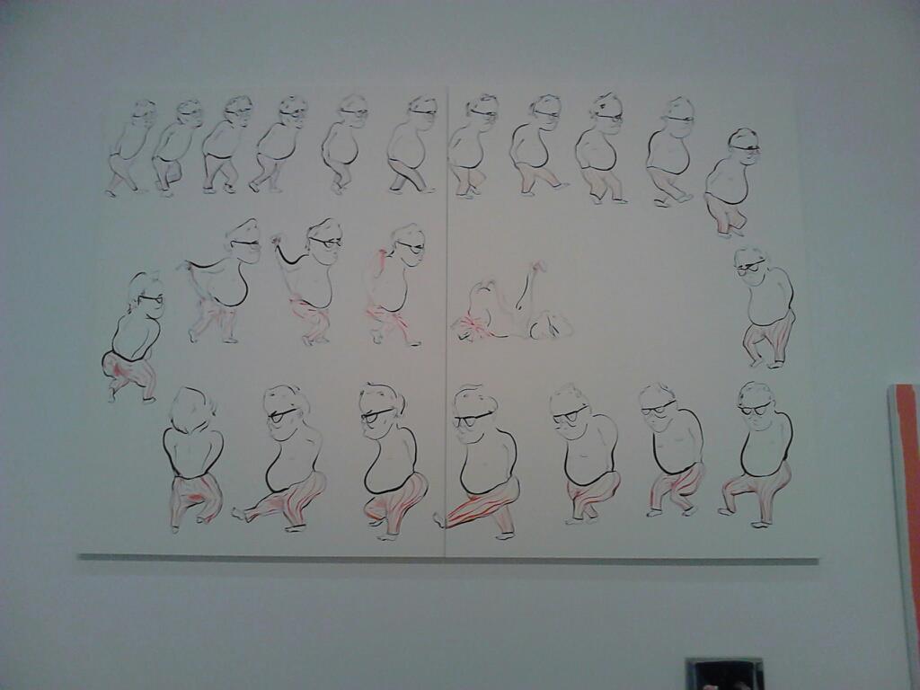 Det är väldigt mycket pissande på bilderna. Och mycket röv. Det ser ut som om Tala Madani lärt sig rita en typ av gubbe, en svartmuskig tjockis, och denna figur och varianter på den återkommer på de flesta bilderna och i filmerna. Mycket ser ut som slarviga skämtteckningar. Men vad det är för värld hon speglar vet jag inte riktigt. Är det något iranskt? Curatorernas beskrivning i presentationstexten av vad det hela är och vad det går ut på känns mest kryptisk. Curatorerna hävder även att det är en gammal dröm att få ställa ut Tala Madani och att de första gången kontaktade henne 2009.