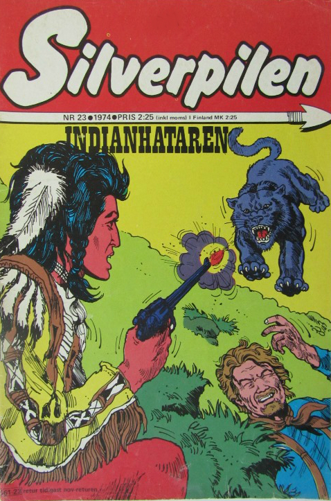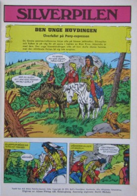 Jag vet inte riktigt varför jag tilltalades av Silverpilen. Jag inbillar mig att även föräldrar ansåg Silverpilen vara bättre än andra western- och äventyrsserier i serietidningsställen. Var det för att serien var snällare än mycket annat? Och indianbönan Månstråle hade en framträdande roll. Hon kunde judo, så hon blev per automatik cool. (Nu när jag tänker efter – hur hade hon lärt sig judo? Fanns där månne en japan i Kiowalägret?) Den unge Kiowahövdingen Silverpilens blodsbroder hette Falken och var en vit kille. Tydligen hette Falken Pekka Kenttä i Finland! Det måste vara världens sämsta namn på en westernhjälte alla kategorier.