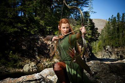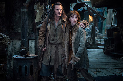Nå. Dvärgarna flyr från alverna och träffar på bågskytten Bard (Luke Evans), som motvilligt hjälper dem och tar dem till den fallfärdiga Sjöstaden, där han bor med sin familj. Jag har alltid tyckt att Luke Evans är lik Orlando Bloom, så det är ju förvirrande att båda är med här. Fast Evans ser ut som en äldre och manligare Bloom. Bard är den enda mänskliga hjälten i berättelsen.