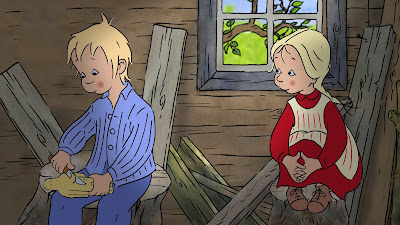 Men icke. Man verkar ha utgått från de gamla talskivorna (eller var det från början radioprogram?) på vilka Lindgren läser sina sagor. Filmen består av en rad korta, sammanfogade episoder, som om man klippt ihop en TV-serie. Vilket man antagligen har gjort. Slarvigt. Av någon anledning har Åhlin och medregissörerna Alicja Björk och Lasse Persson inte noterat alla upprepningar. Allting upprepas. ”Här är snickarboden,” säger Astrid. ”Här är drängen Alfred.” Tio minuter senare förklaras det igen vilka figurerna är och var de befinner sig. Och igen – och igen.
