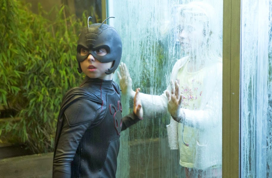 Jag läser att Antboys kostym är den dyraste som någonsin förekommit i en dansk film, vilket låter otroligt, men i övrigt är detta en lågbudgetfilm – jag vet inte vad den kostade, men enligt regissör Hasselbalch kostade ANTBOY ungefär lika mycket pengar som MAN OF STEELS filmteam spenderade på latte. Och det här ser rätt billigt ut. Effekterna är inte vidare imponerande, men till större delen effektiva, charmiga och fungerande.