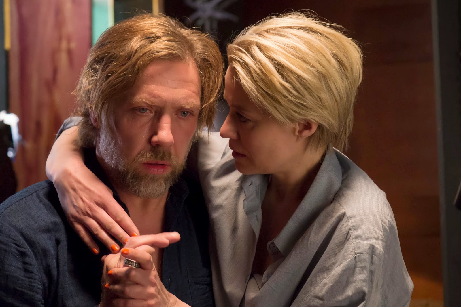 Pernille Fischer Christensen har regisserat och även skrivit manus, det senare tillsammans med Kim Fupz Aakeson (EN GANSKA SNÄLL MAN), och Persbrandt spelar Thomas Jacob – dansk sångstjärna. Eller … Är han dansk? Jag pratade med några kollegor efter pressvisningen, och vi blev inte kloka på Thomas Jacob. Filmen inleds med att han återvänder hem till Danmark. Men han pratar svenska. Hans producent Molly (Trine Dyrholm) är danska. Hans dotter Julie (Birgitte Hjort Sørensen) är danska. Hennes elvaårige son Noa – Thomas’ barnbarn – pratar danska. Thomas’ assistent Kate (Eve Best) är från England, så där pratas det engelska. Thomas Jacob glider omkring som firad dansk stjärna – och pratar aldrig danska. Och även om han pratar svenska, har inga problem med att förstå honom. De enda som inte förstår vad Mikael Persbrandt säger i den här filmen, är jag och resten av publiken. All dansk och engelsk dialog är textad på svenska – men när Persbrandt pratar svenska försvinner textremsan. Och det är då den behövs! Efter filmen satt två män bakom och diskuterade det faktum att de inte uppfattat Persbrandts repliker. Jag själv nämnde det för en garvad kritikerveteran, vi kan kalla henne ”Annika på Sydsvenskan”, och hon hade också suttit och koncentrerat sig för att uppfatta de mumlade grymtningar Persbrandt får ur sig.