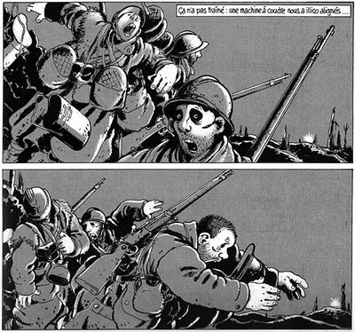 Ojdå, det var oväntat. Men ändå inte, historiehyllorna i handeln håller på att svämma över av första världskrigsböcker, så skulle det ske så var det väl nu. Jag lyckades hitta den här i en bokhandel i Grenoble 1995 – ”lyckades hitta”, för jag letade verkligen efter den och hade bara ett par timmar på mig. Tror att Tardi kanske slutgiltigt blev botad från sin besatthet av första världskriget, åtminstone tror jag inte hans senare serier berört det så mycket utan handlat mer om andra epoker. Har exempelvis en fyra band lång serie om Pariskommunen som jag inte orkat traggla mig igenom än.