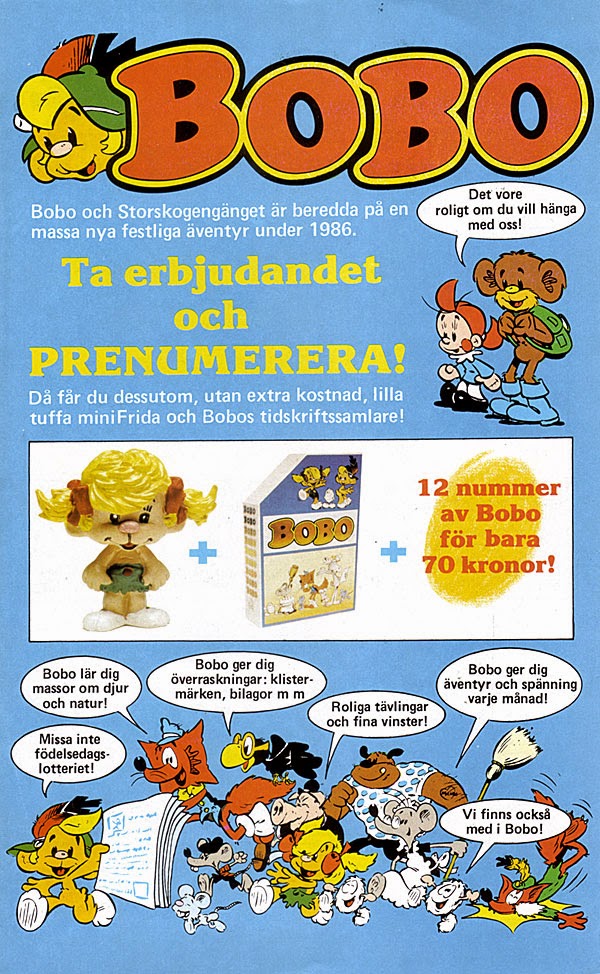 Bobo hette en serietidning som kom ut mellan 1978 och 1989 och min lillasyster köpte den de första åren. Det var mer eller mindre en kopia på Bamse – och en väldigt konstig serie. Ännu konstigare sedd så här i backspegeln. Trollbjörnen Bobo bor i en grotta, där han sitter och äter saltgurka. En docka hette Klara. Och så fanns det något som hette flaxkikaren. Populärast var de små smurfkopiorna Gnuttarna, som ett tag hade en egen serietidning. Tydligen gjorde Bobo stort intryck på Coco Moodysson, eftersom två av huvudpersonerna i hennes seriealbum ”Aldrig godnatt”, som blev filmen VI ÄR BÄST!, heter Bobo och Klara.