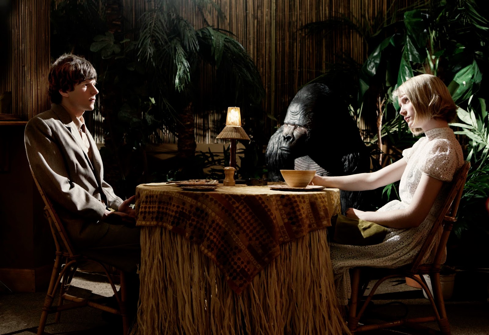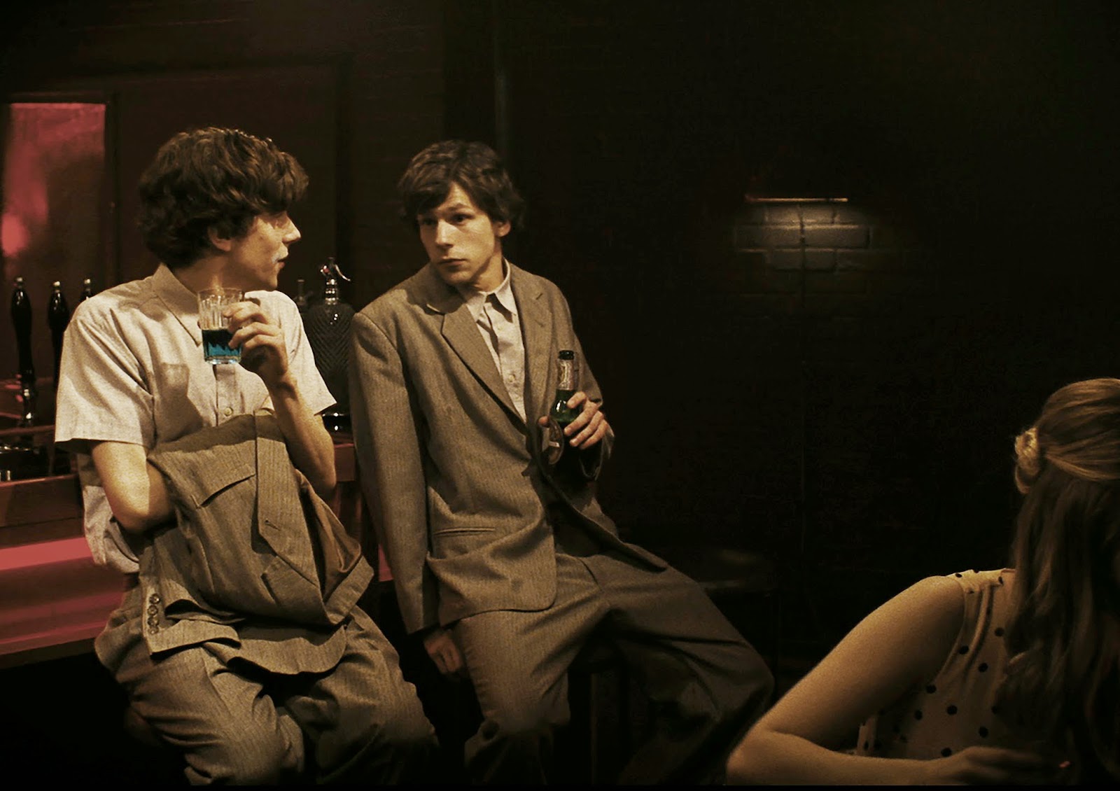 Företaget Simon jobbar på leds med järnhand av någon som kallas Översten (gamle fine James Fox), som figurerar i besynnerliga reklamfilmer, Wallace Shawn spelar mr Papadopoulos, som är något slags ettrig chef, Phyllis Sommerville gör Simons sjuka – och elaka – mor, vid hennes sida sitter en otroligt konstig kvinna och säger konstigheter, medan en manlig sköterska kräver att få alla kontanter Simon har på sig. Jesse Eisenberg är väldigt bra i den dubbla huvudrollen; i vanliga fall brukar jag tycka att han är rätt blek och enkelspårig.