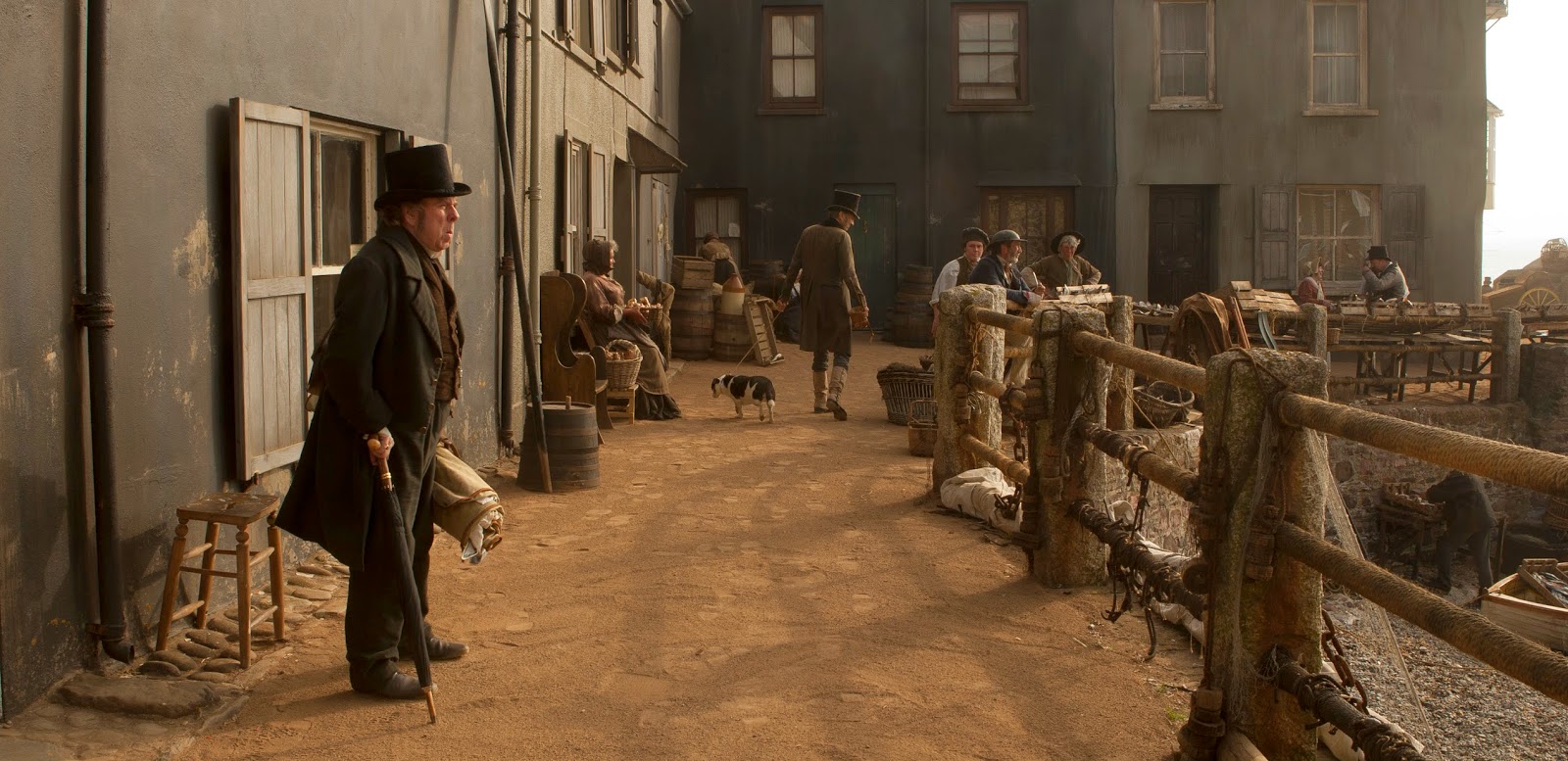 Den brittiske målaren Joseph Mallord William Turner dog 1851 och Leighs film om honom inleds ett kvartssekel innan detta år – läser jag mig till på pressidan. Några årtal anges aldrig i filmen. Aldrig platser heller. Detta skapar viss förvirring. Filmen öppnar i Holland, men ganska omgående kommer Turner (Timothy Spall) hem till London. Jag utgår från att det är London. Senare i filmen pratas det om att han bor i London. Då och då beger han sig till Chelsea, där han under falskt namn tar in på ett rum – att det är Chelsea framkommer inte förrän långt senare. Alla samhällen ser ungefär likadana ut, fast i Chelsea huserar han precis vid kusten.