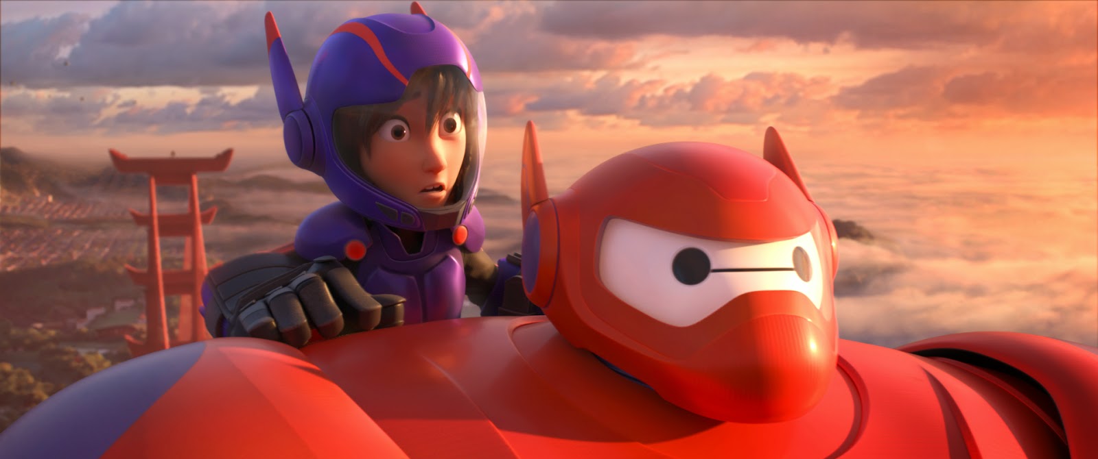 Hiro måste stoppa skurken, och han får hjälp av fyra elever från skolan, vilka förses med superhjältedräkter med olika funktioner, och den kramgoa Baymax programmeras så att han kan karate och han stoppas in i en tuffare rustning som kan flyga; han liknar de klassiska japanska jätterobotarna som Goldrake och allt vad de heter.