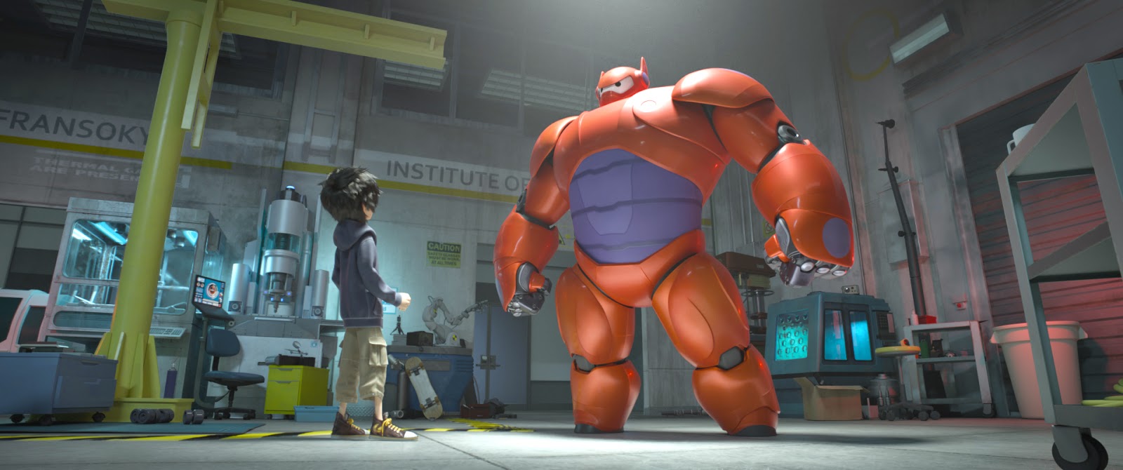 För regin står Don Hall (NALLE PUHS FILM – NYA ÄVENTYR I SJUMILASKOGEN) och Chris Williams (den bortglömda BOLT). BIG HERO 6 utspelar sig i storstaden San Fransokyo, ett slags blandning av Japan och USA, fyllt med sådant filmskaparna gillar – och de verkar verkligen gilla serietidningar och populärkultur från de här två länderna. Det utspelar sig väl i en nära framtid, skulle jag tro, och huvudperson är den föräldralösa fjortonåringen Hiro (som i ”hero”), som tillsammans med sin äldre bror Tadashi bor hos sin moster Kate – Kate har inte bara ett engelskt namn, hon ser även västerländsk ut.