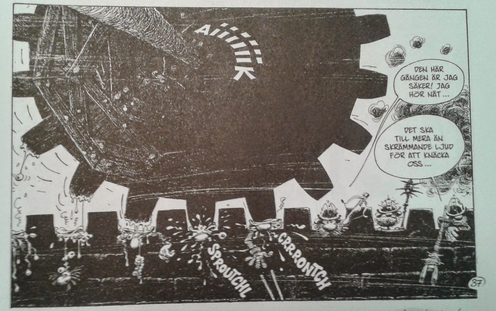 Det handlar om satir och humor av svartaste slag. Franquin använder sig av silhuetter i denna svartvita serie, för att verkligen understryka innehållet på effektivast möjliga sätt – och metoden är minst sagt slagkraftig. Franquin, som var djupt deprimerad under stora delar av de år han tecknade serien, slår ofta mot företeelser han ogillar: miljöförstöring, militarism, jägare och mäktiga företag. Ska jag invända mot något skulle det vara att satiren i vissa episoder är lite väl simpel och lättköpt, det känns ibland som politiska propagandaserier inför något val eller liknande. Tydligen tyckte även Franquin det i efterhand, läser jag i Björn Wahlbergs långa och utmärkta förord; upphovsmannen hade många invändningar mot sitt verk. Men det kan jag ta, eftersom majoriteten av dessa svarta idéer är bra, många är fantastiska – och samtliga är fantastiska att titta på.