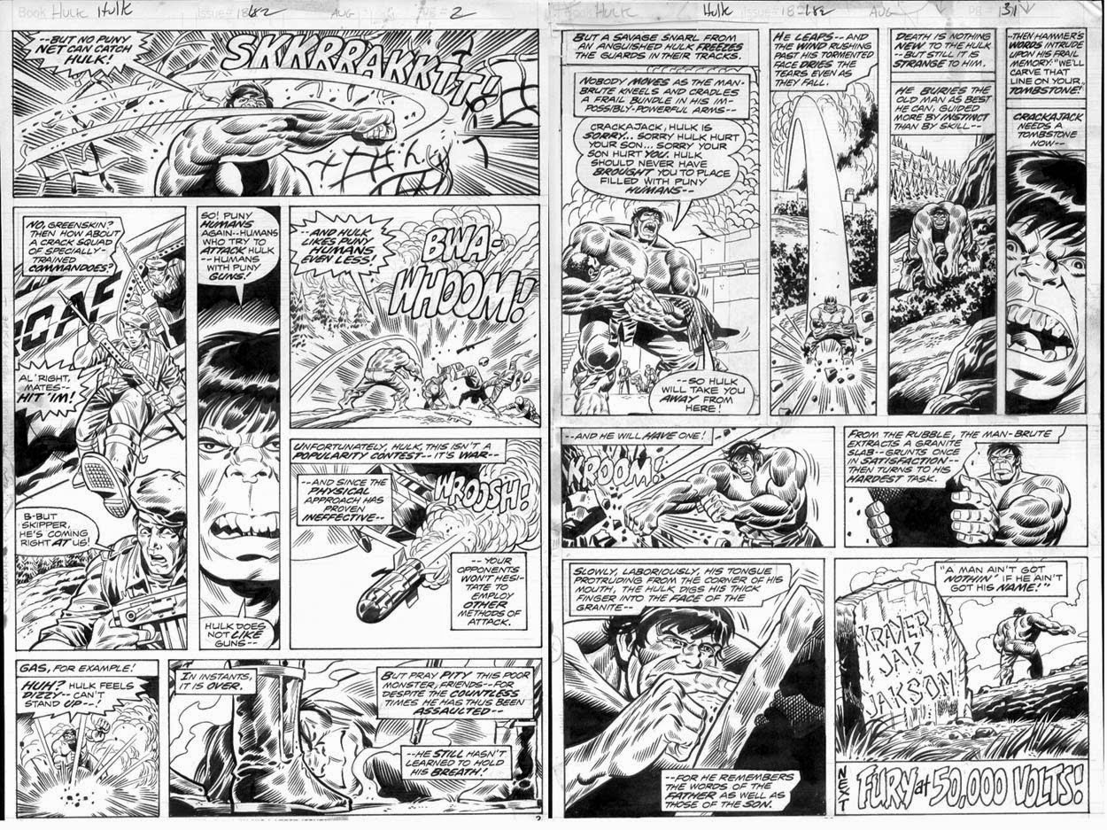 Jag har sett en hel del grejor av Herb Trimpe som inte varit lika trist tecknat som hans Hulk. Jag gissar att virtuosa tuschare kunde tillföra hans skisser en hel del. Och jag gissar att han haft gott om tid på sig när han gjort sina mer vältecknade och detaljerade serier.
