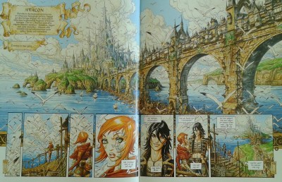 Ledroit får mig att tänka på P Craig Russell, en kille som gör fantasy- och sagoserier med ibland vackra, men oftast överlastade och kitschiga teckningar. Russells serier brukar vara svårlästa – men det är inget mot Ledroits serie. Seriesidorna och uppslagen består av en enda stor teckning, på vilken övriga serierutor lagts. Oftast huller om buller. Vilket även gäller textplattor och pratbubblor. Jag är van serieläsare, men i det här fallet hände det alldeles för ofta att jag stannade upp och undrade i vilken ordning jag skulle läsa rutorna, hur jag skulle tolka sidorna.