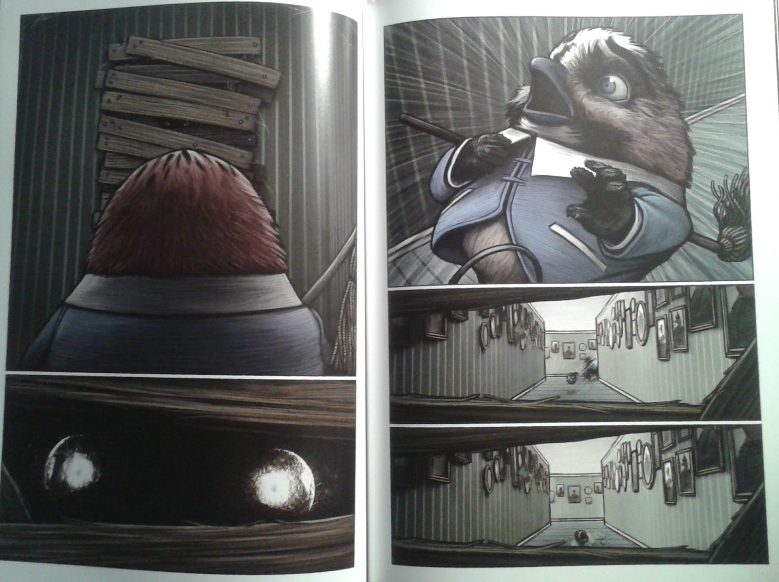 ”Lilla fågel Blå” är mer än ett seriealbum, det är lika mycket en konstbok. Jag ser framför mig hur de imponerande, målade sidorna hänger bredvid varandra på ett konstgalleri – det hade blivit en häftig utställning! Berättande är filmiskt, med åkningar och panoreringar; små detaljer som ändras från bild till bild. Vissa scener känns som plockade ur ett TV-spel, där man går längs skumma korridorer och spänt väntar på att något otäckt ska hända.