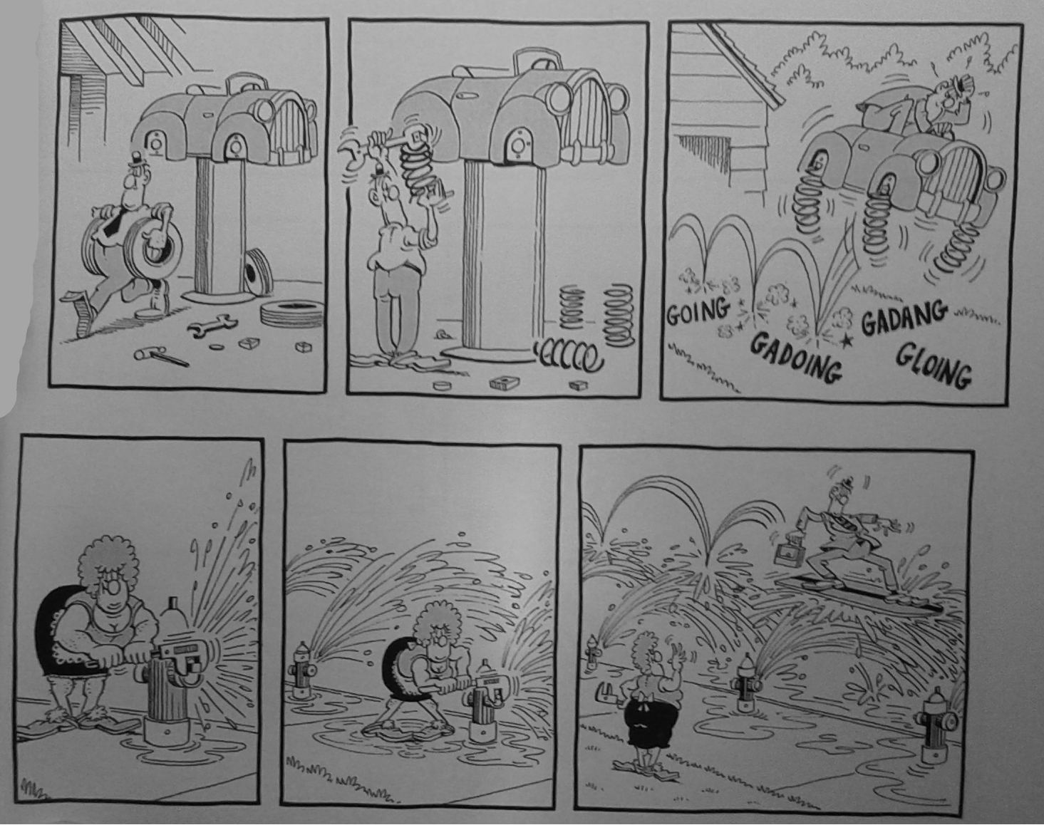Alldeles för mycket i det här albumet är inte roligt alls. Ett par serier hade jag till och med svårt att förstå – jag fick titta väldigt noga för att upptäcka poängen, eller tolka slutet. Det är främst de tidiga serierna som är lite luddiga till innehållet eller har svaga poänger. Han levde rätt mycket på sin skojiga teckningsstil, Don Martin, kanske spelade det ingen roll att det inte var så roligt.