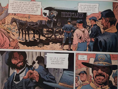 För att vara en ”död” genre, publiceras det överraskande mycket westernserier i Sverige just nu. Blueberry samlas i feta volymer, Lucky Luke dök upp i ett så kallat alternativt äventyr vid sidan av sin ordinarie serie, som också ges ut här, Blårockarna är aktuella med ett nytt album – och här har vi ett album jag varit väldigt sugen på att läsa. En del av er har, till skillnad från mig, kanske redan läst serien när den gick som följetong i Fantomen, men det är så här den ska läsas: i stort format, inbunden och på bra papper.