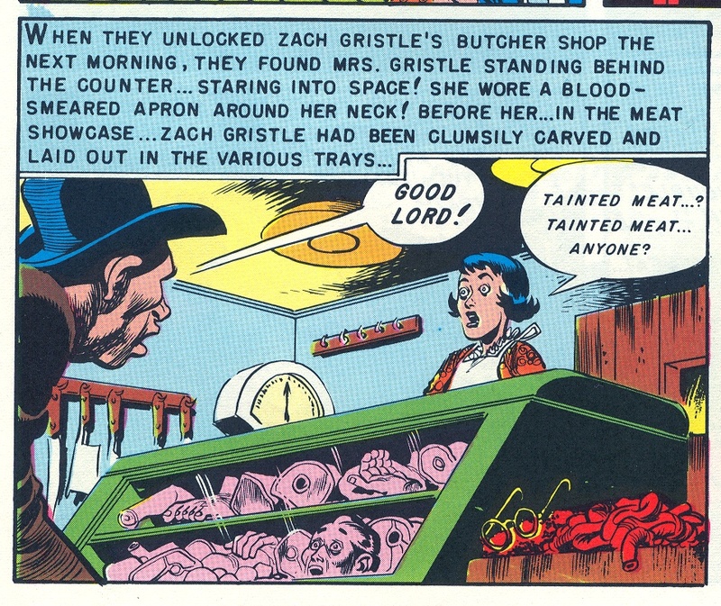 Så blev det 1950-tal och legendariska förlaget EC Comics kom in i bilden. Någon gång runt 1980 hittade jag seriealbumet ”Stora skräckboken” från 1974 på antikvariatet Fyndshopen på Eriksgatan i Landskrona. Det var ett riktigt risigt exemplar, men det spelade ingen roll. Redigerad av Sture Hegerfors innehöll albumet en rad klassiska skräckserier från det för mig då okända EC Comics, och tidningar som Tales from the Crypt och Vault of Horror. Här fanns serien ”Taint’d meat … It’s the humanity!” tecknad av Jack Davis (jag tror den hette något i stil med ”Skämt kött är inte bara skämt” på svenska). Denna historia om hur en slaktare säljer dåligt kött som tar kål på folk, och av misstag råkar förgifta sin son, vilket får hustrun att stycka och sälja slaktaren, gjorde stort intryck på mig. Albumet innehöll även en presentation av Davis från 50-talet, så nu fick jag veta lite mer om honom.