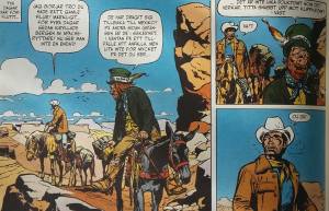Det är fascinerande att se hur Jean Giraud utvecklas, nästan sida för sida. I ”I Navajos spår” börjar han närma sig den stil vi är vana vid, det är långtifrån så valhänt som de tidigaste albumen, och även färgläggningen blir bättre.
