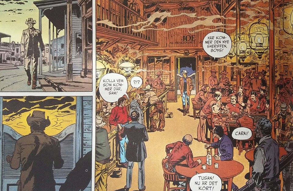 Så är vi då framme vid ”Mannen med silverstjärnan” (i Pilote 1966, franskt album 1969). Det långa äventyret om apacherna är nu slut, och Charlier och Giraud klämmer in ett fristående äventyr. När jag tidigare har läst om detta album, har det alltid omnämnts som en bagatell. Visst, vid sidan av de långa, episka, extremt dramatiska äventyren, är ”Mannen med silverstjärnan” en bagatell, men som robust westernäventyr är denna pastisch på Howard Hawks film ”Rio Bravo” utmärkt.