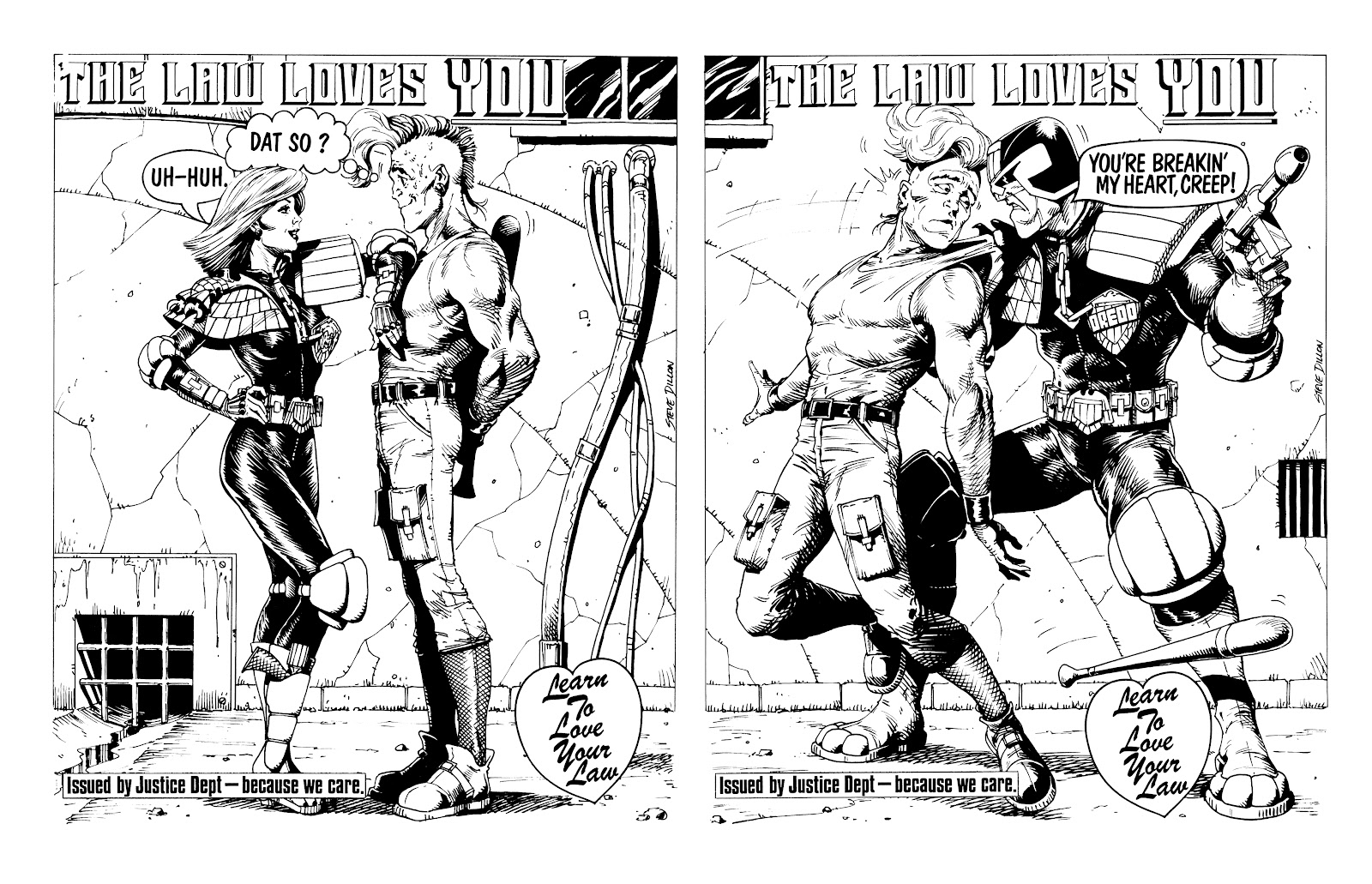 Steve Dillon fick sitt första serieknäck redan när han var sexton år gammal; då ritade han Hulk i en veckotidning från Marvel UK. 1980 sattes han på att rita serier om Doctor Who, och året därpå började han rita serier för klassiska brittiska serietidningar som Warrior och 2000AD; förutom Judge Dredd gjorde han bland annat Rogue Trooper, ABC Warriors och Tyranny Rex.