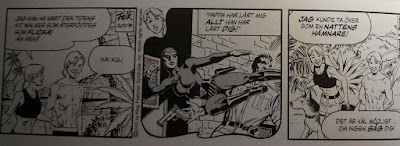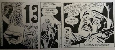 Först ut är ”Hajnästet” från 1938 av Lee Falk och Ray Moore. Jag gillar Ray Moore; den förste Fantomentecknaren. Hans ruffigt eleganta stil formligen dryper av mystik och äventyr. Fast denna mystik skär sig ibland med innehållet. På den här tiden var nämligen Fantomen en riktigt skön snubbe. Han var hård mot de hårda och en hemlighetsfull man, men samtidigt en skämtsam ironiker alla brudar föll som käglor för.