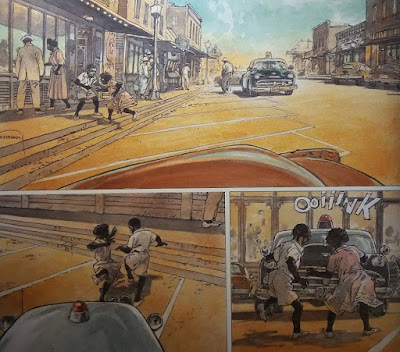 Nyligen recenserade jag den första samlingsvolymen med westernserien Comanche, som Hermann tecknade. Sedan dess; 1960- och 70-talen, har Hermann förändrat sin teckningsstil ganska radikalt. Redan på 80-talet, när han gjorde medeltidsserien ”Tour de Bois-Maury”, som gick i Comet och Epix, tyckte jag att han började lämna den välbekanta stilen från Comanche och Bernard Prince. Jag har inte läst så mycket av det Hermann producerat sedan dess, men numera har han skippat alla streck och skrafferingar, och jobbar istället med färger.