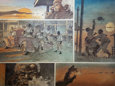 ”Old Pa Anderson” är berättat på ett sätt jag är ganska svag för. Serien bygger nästan helt på stämningar. Dialogen är knapp, sidorna består till stor del av ”tysta” rutor, ett grepp som skapar de stämningar upphovsmännen är ute efter – melankoli, drama, vemod, uppgivenhet, med mera. Jag ska inte säga att det är en nackdel, men denna berättarteknik kräver förstås utrymme. ”Old Pa Anderson” är 54 sidor lång, och känns som en kort novell; det är väldigt snabbläst. Här kan man jämföra med hur mycket Charlier och Giraud lyckades klämma in på 46 sidor i Blueberry, där varje album närmast känns som en roman.