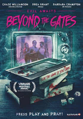BEYOND THE GATES bygger på ett gammalt brädspel; ”Nightmare”, jag aldrig hört talas om – vilket inte är så konstigt, jag är inte det minsta intresserad av brädspel. Regissören Jackson Stewart långfilmsdebuterar med den här filmen, hans tidigare claim to fame är att han skrivit ett avsnitt av TV-serien SUPERNATURAL. En av producenterna är Barbara Crampton, som även medverkar i en liten roll.