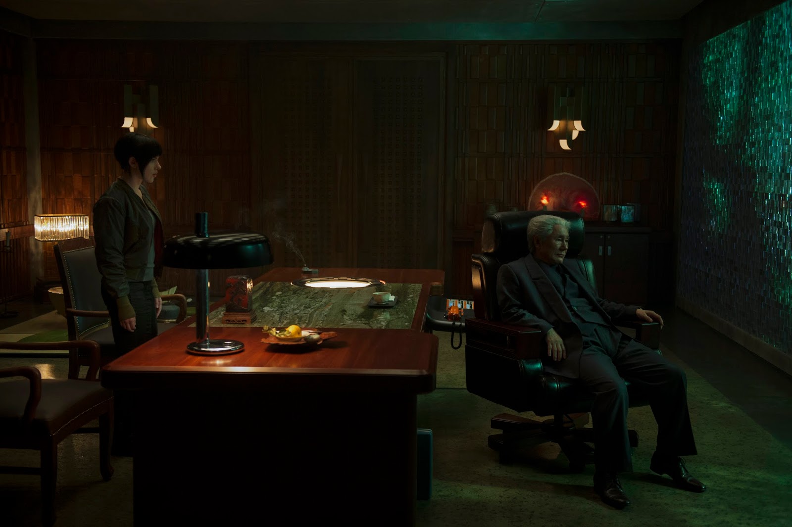 Major jobbar som något slags RoboCop i denna Blade Runner-värld. Takeshi Kitano gör hennes chef. Han pratar bara japanska. Major och hennes kollega Batou (danske Pilou Asbæk) jagar en mystisk skurk, som slaktat en massa människor och robotar. Men det är något som inte stämmer med fallet. Och det är något som inte stämmer med Major – kan hon verkligen lita på företaget som byggt henne? Är hon den doktor Ouelet (Juliette Binoche) sagt att hon är? Är hennes minnen äkta eller inplanterade?