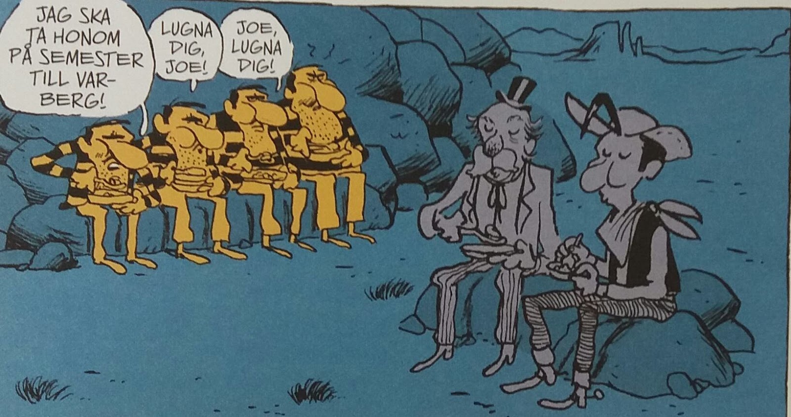 Hej! Du undrade vad Joe Daltons hot om att ta med Luke till Varberg kan ha varit på originalspråket. Hotet är att ta Luke på semester i Arcachon, en badort och tillika turistfälla på franska västkusten. Jag funderade på vad det fanns för motsvarighet på svenska västkusten, och som boråsare föll mitt val på Varberg, dit ”alla” boråsare åker. Vänliga hälsningar, Stefan, översättare.