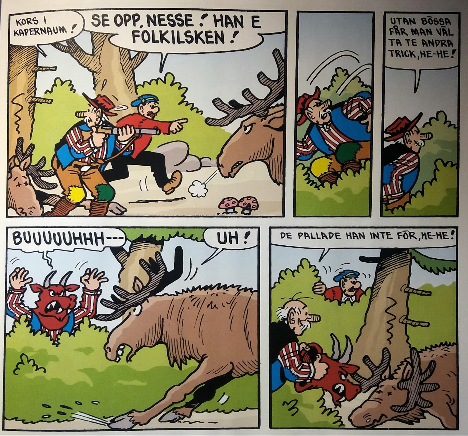 Nå. Vad ska jag säga om albumets innehåll? Nja, jag vet inte. Det här handlar bara om korta, sketchartade episoder, här finns inga serier med ordentlig handling. De flesta är ansträngda och trötta. Bengt Linders serier är något bättre, eftersom de har en tendens att bli direkt bisarra. De följer sin egen logik – det vill säga, det finns ingen logik alls. Om Åsa-Nisse plötsligt behöver en monstermask när han är ute och jagar älg, så har han plötsligt en sådan i nästa ruta. Linder brydde sig aldrig om att förklara hur saker och ting hänger ihop. Och det är ju lite charmigt.