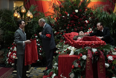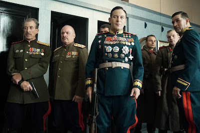 … Men filmen har jag i alla fall sett. Och det var inte utan att jag lämnade salongen lite besviken. Det är skotten Armando Iannucci som regisserat den här filmen, producerad av franska Gaumont. I eftertexterna står det att Fabien Nury står för ”original screenplay” – men det är fyra andra herrar, varav Ianucci är en, som skrivit den här filmens manus. Detta får mig att undra. Hade Nury skrivit ett filmmanus ingen gillade och som skrevs om helt och hållet – och på engelska? Dessutom står en av manusförfattarna för ”additional material”.