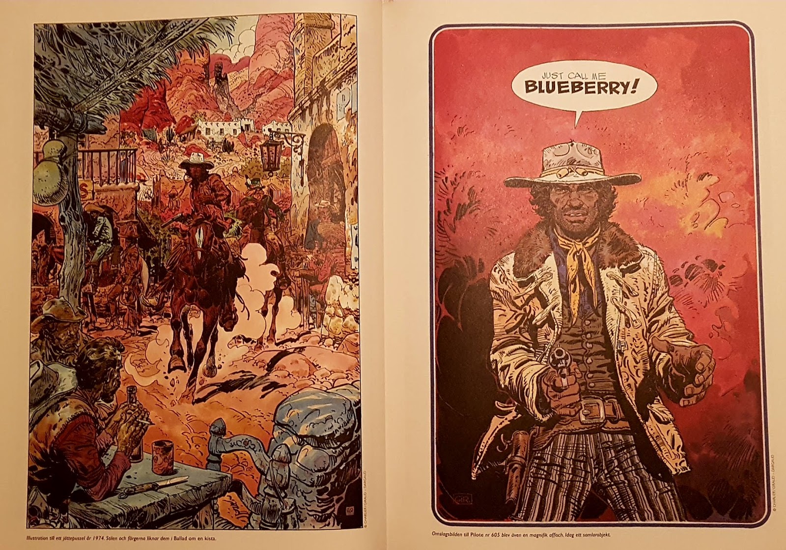 Liksom de tidigare volymerna, inleds ”Samlade äventyr 5” med fylliga artiklar, denna gång får vi extra mycket bonusläsning och mer än ett förord. Bland annat analyseras Girauds teckningsstil av en fransk serietecknare. Här finns även flera exempel på hur Giraud redigerade och förbättrade sina seriesidor innan de samlades i album, och vi får se gamla omslag till Pilote, en affisch, ett pussel, gamla annonser, med mera. Jag skulle inte ha något emot att en dag få se allt Blueberrymaterial; alla omslag, måningar, annonser, allt som inte finns i seriealbumen, samlat i en flott bok.