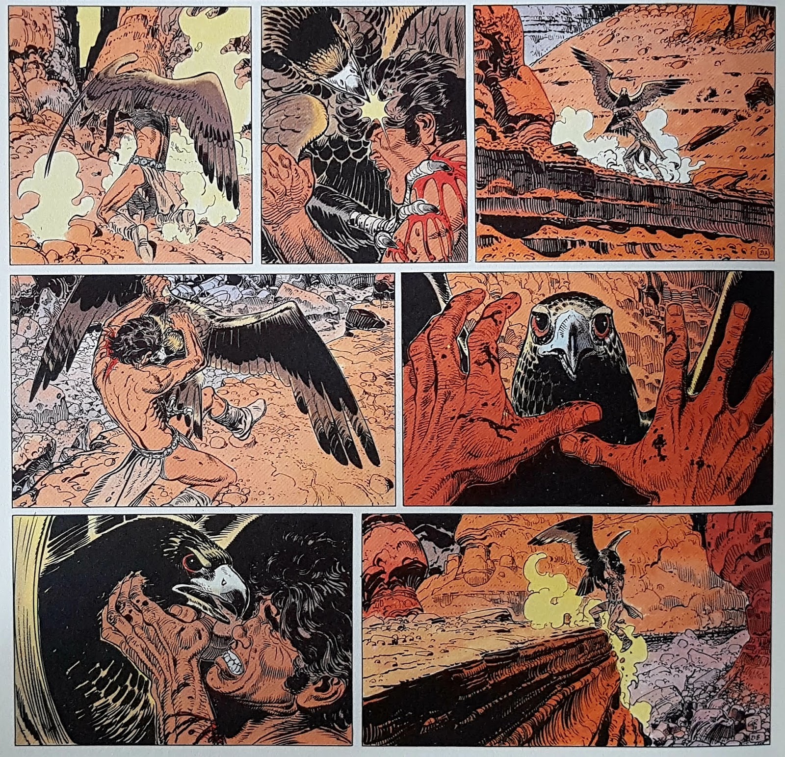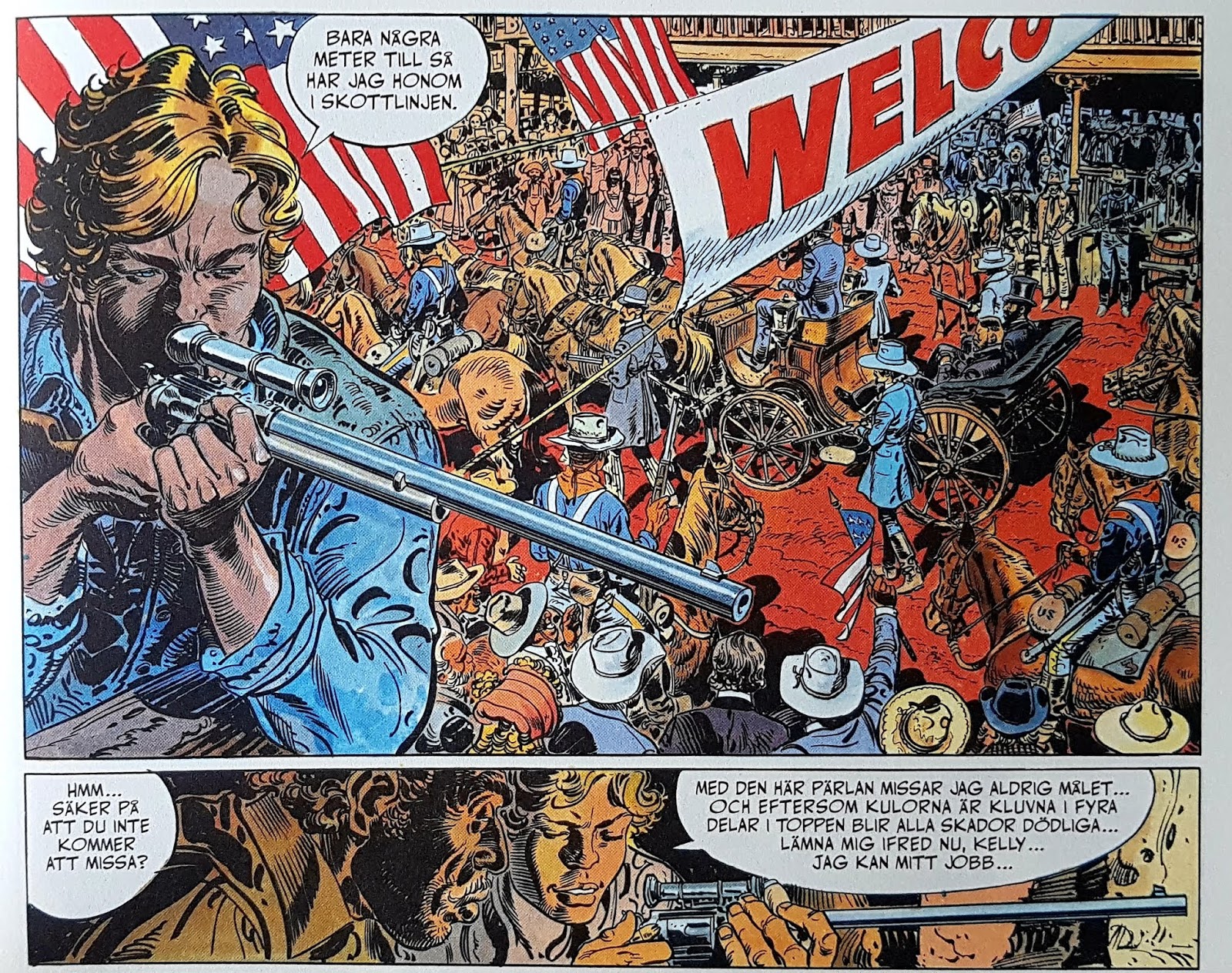 ”Fredlös” och ”Angel Face” är fantastiskt bra tecknade av Jean Giraud, och både handling och berättarteknik blir alltmer komplex. Men! Nu kommer vi fram till ”Knäckta näsan”. Och här – här peakar Jean Giraud som tecknare.