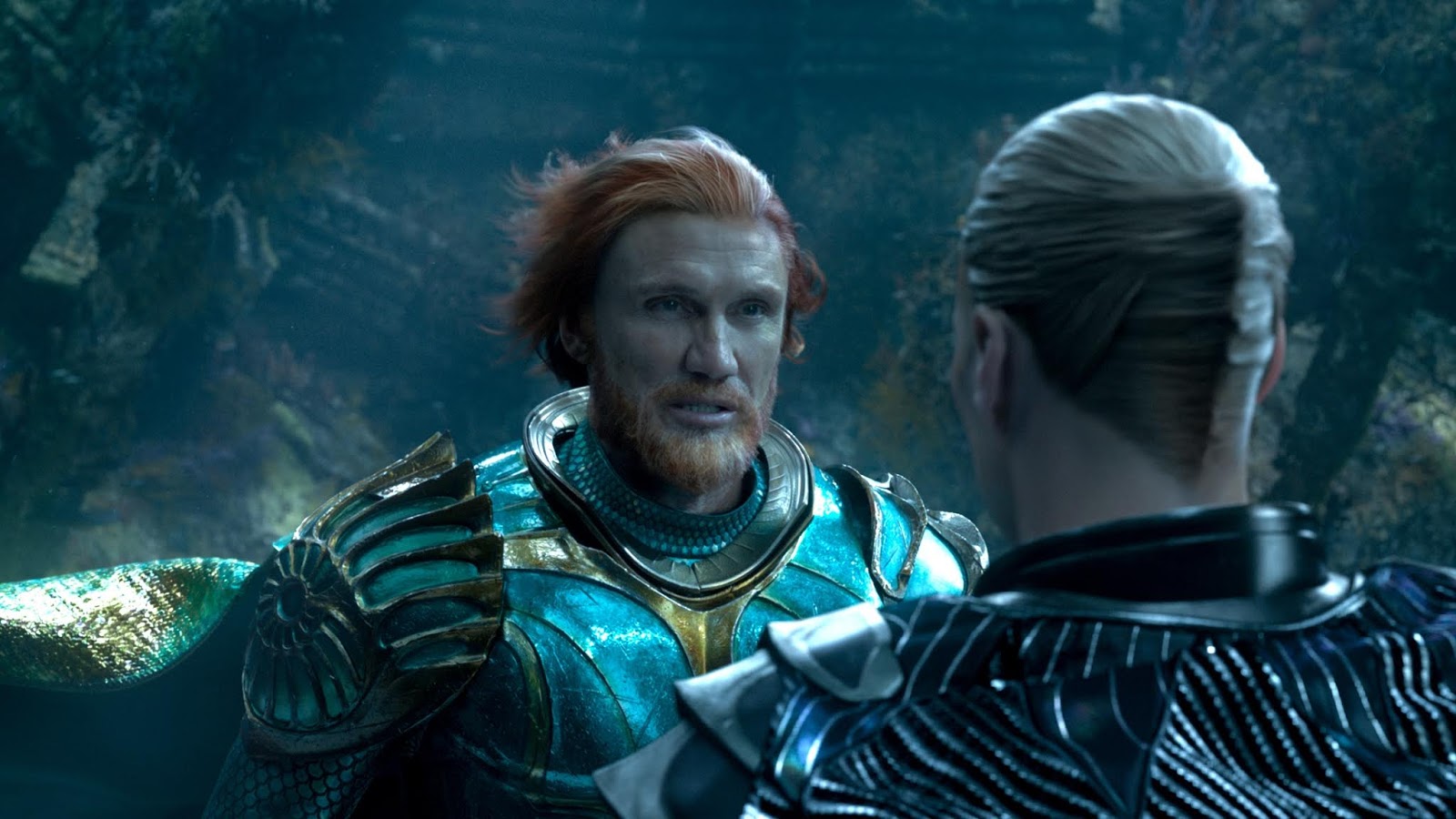 Vattenmannen går och tar en öl med farsan (Temuera Morrison) i en festlig scen. Därefter förflyttas vi ner under vattnet, där kung Nereus (Dolph Lundgren) och den onde kung Orm (Patrick Wilson) ska ha ett möte och diskutera viktiga saker, som världsherravälde och kamp mot ytfolket. Scenen när de ridande på jättefiskar anländer till Atlantis är otroligt mäktig.