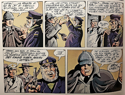 Claes Reimerthi (som 1985 kallade sig Michael Tierres) står för manus, medan Jaime Vallvé tecknat. Claes var verkligen i sitt esse när han skrev den här; här fick han jobba med ett mordmysterium i 1800-talets London, något jag vet att Claes älskar. En enorm diamant har stulits i Bombay, den smugglas ombord på ett fartyg, mystiska indier tar sig ombord, och en man hittas ihjälstucken i en hytt låst från insidan. Det slutna rummets gåta. Ett klassiskt deckarupplägg. Storyn är kanske inget utöver det vanliga, men det är ett bra och trevligt äventyr.