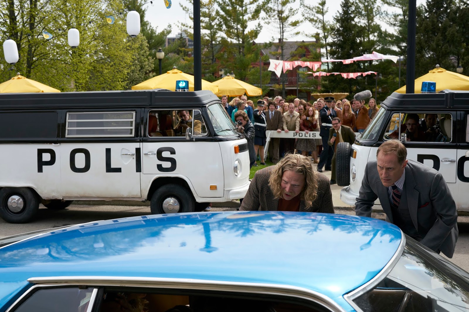 Ibland kommer polisen på besök. Banken är omringad, och det är bara för polischefen Mattsson att knalla in och ut som han vill. Mattsson spelas av kanadensaren Christopher Heyerdahl, som pratar med samma sjungande norska brytning som i TV-serien HELL ON WHEELS. Shanti Roney spelar Olof Palme i två-tre besynnerliga scener. Han sitter ensam vid skrivbordet på sitt flotta kontor och äter middag och dricker rödvin.