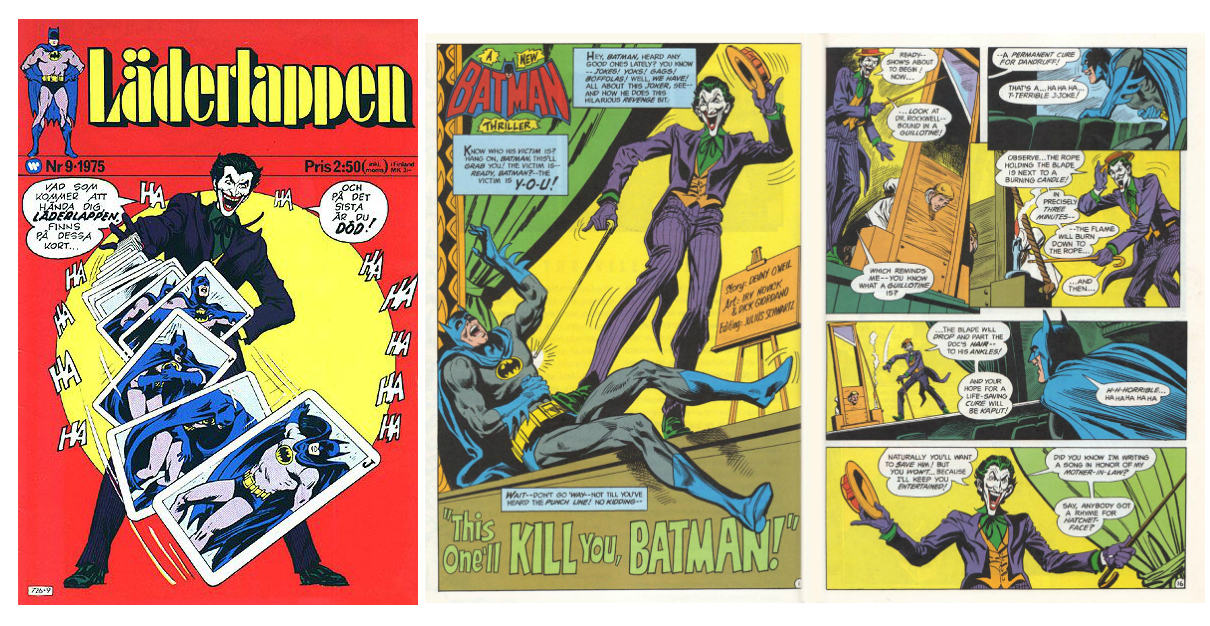 Läderlappen 9/1975 gjorde stort intryck på mig. Jag hade läst Läderlappen tidigare, men detta var första gången jag läste en historia om Jokern. Jag tyckte att äventyret var rätt otäckt, med alla maniskt skrattande människor, och slutet med giljotinen var riktigt jävla skrämmande. Och Jokern – jag tyckte att han var genuint obehagligt, det fanns inget töntigt eller löjeväckande över denna grymma galning.
