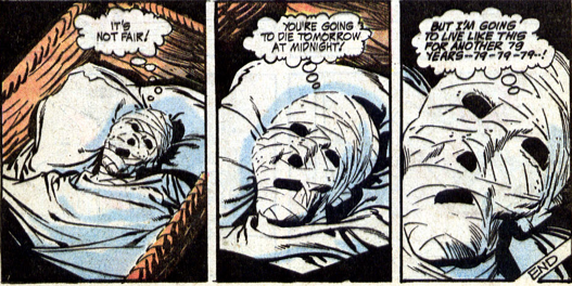 I den här gamla serien får en man tag på en mystisk klocka som visar när man ska dö. Mannen får veta att han kommer att leva i ytterligare 79 år. I ett besynnerligt försök att tjäna mycket pengar, blir han en våghals som utför dödsföraktande stunts. Han kan ju ändå inte dö. Nej, jag vet, logiken haltar betänkligt, karln blir ju inte osårbar. I vilket fall – en kvinna dör under en misslyckad stuntuppvisning, och hennes make hämnas genom att kasta en handgranat på den våghalsige huvudpersonen. Serien slutar med att han är ett vårdpaket utan armar, ben, syn och talförmåga. Han hör läkarna säga att han förväntas dö när som helst – men han vet ju att han kommer att ligga där i ytterligare 79 år.
