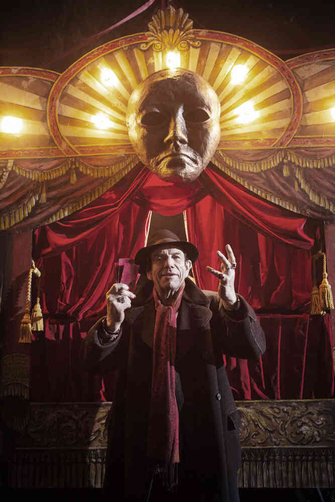 Väl där placeras de vid dukade bord i en flott sal. De serveras en fin middag (och redan här gissade jag vad det är de egentligen äter). Mannen bakom teaterföreställningen, Mathias (Thorbjørn Harr), gör entré på en scen och berättar att det är en interaktiv pjäs. Publiken ska ta på sig masker och sedan gå runt i hotellet, där olika scener spelas upp.