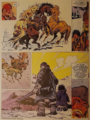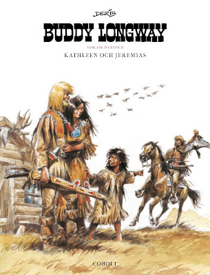 Jag har inte läst de här albumen sedan jag var barn, eller i de yngre tonåren, och det var förstås ett trevligt återseende. När jag växte upp var denna westernserie en av de få serier som rekommenderades av bibliotekarier och andra, ofta fördömande, vuxengrupper. Buddy Longway var en humanistisk western med fokus på naturen, djurlivet, och trapperfamiljen Longways förhållandevis realistiska liv i vildmarken. Visst förekommer det ibland bovar, banditer, och en och annan snarstucken indian, samt smärre actionscener i Buddy Longways äventyr, men till skillnad från till exempel Blueberrys äventyr, så är Deribs serier inte actionäventyr där skjutjärnens lag gäller. De vanligaste westernklichéerna saknas.