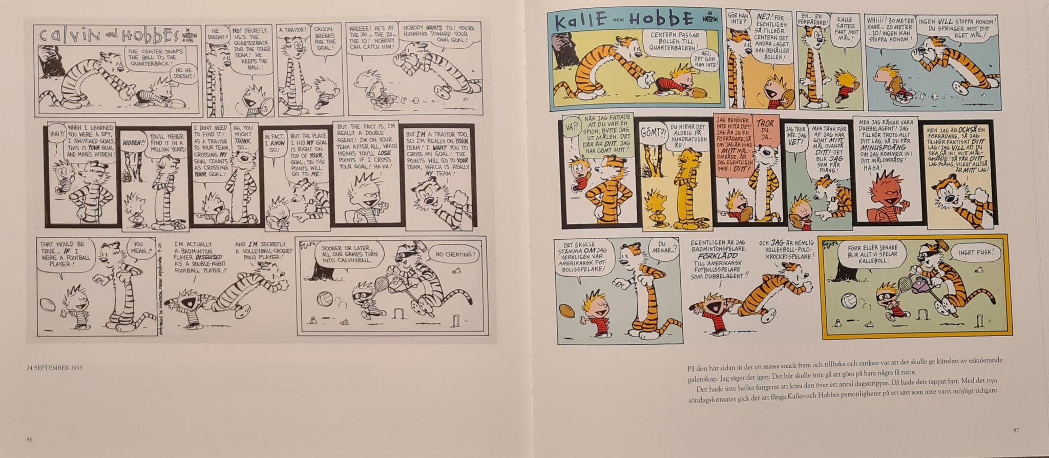 Föreliggande bok innehåller två versioner av varje söndagssida. På vänstersidorna återges Wattersons original – den tuschade sidan i svartvitt, på engelska, med markeringar, en del synliga blyertsstreck, tipp-ex, och annat. På högersidorna ligger samma episod så som den såg ut när den publicerades i tidningar, i färg och översatt till svenska. Bill Watterson kommenterar varje avsnitt med några rader längst ner på sidan. Att få se Wattersons original är förstås kul. I dessa tider då många serietecknare jobbar helt digitalt, är det trevligt att få se tusch på ritkartong. Det är sexigt med gamla serieoriginal.